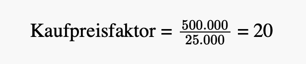 Angenommen, eine Immobilie wird für 500.000 Euro gekauft und erzielt jährliche Mieteinnahmen von 25.000 Euro. Der Kaufpreisfaktor wird somit wie folgt berechnet: